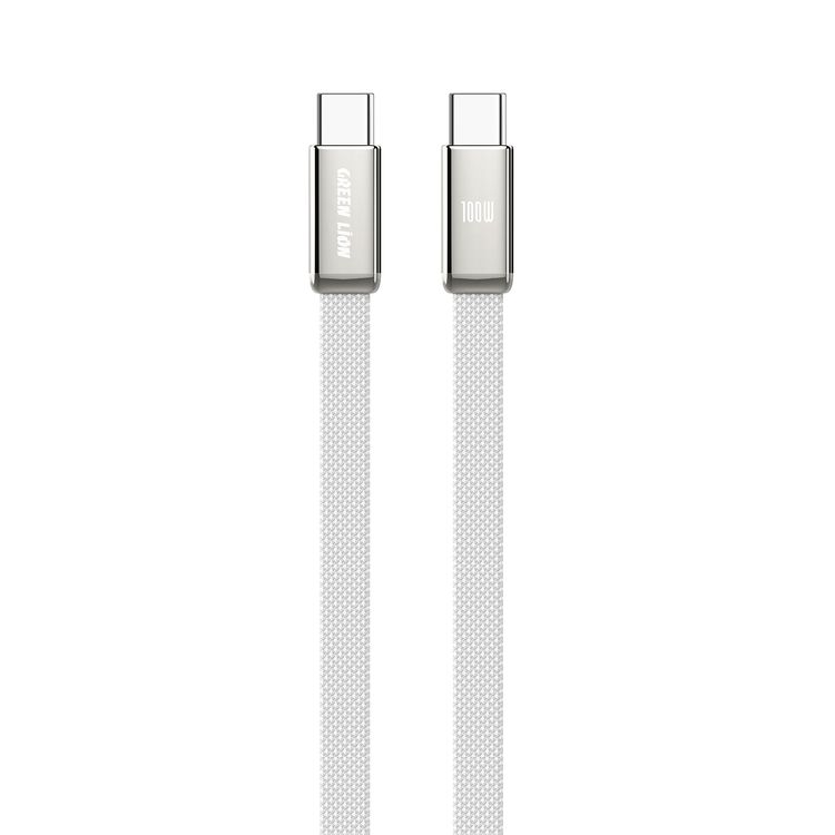 Green Lion Ultra-Thin Braided USB-C to USB-C Cable with 10000 Bends Life Span, Compatible with Laptop, 1m Cable length, Zinc Alloy Shell Connector, Flat-Braided Cable, Charge & Sync, 480Mbps Data Transfer Speed, 100W 20V/5A Cable Current, E-Marker Smart Chip - Silver