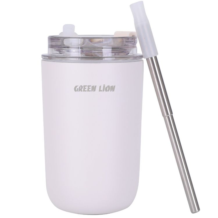 Green Lion Vacuum Travel Mug Lite, 280 mL Capacity, Keeping Hot for 6 Hours and Cold for 12 Hours, Food Grade Silicone Straw, Food Grade Stainless Steel Cup - White