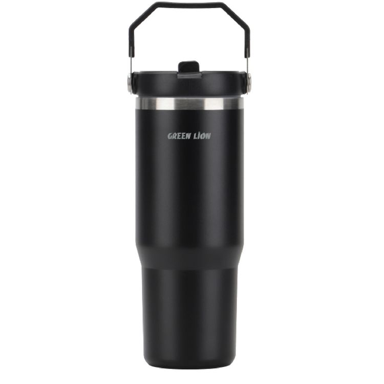 Green Lion Vacuum Tumbler with 900mL Capacity, Stainless Steel Material, Double-Wall Vacuum Insulation, Flip Straw Lid, Portable Handle, Food-Grade Material - Black