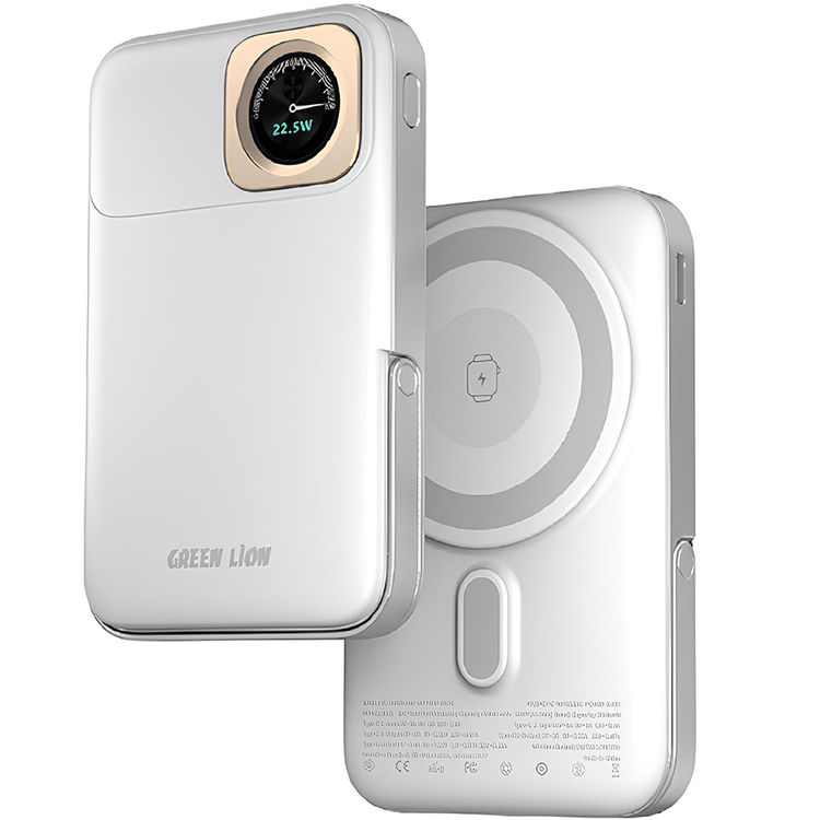 Green Lion Volt Gauge 10000mAh Power Bank with Dual USB-C Ports, ABS & PC Material, 15W Wireless Output, 22.5W Power Delivery, Flight Approved, Built-in Kickstand, Fast Charge Support - White