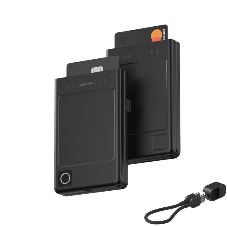 Green Lion Wallet 5000mAh Power Bank with 16.5cm USB-C to USB-C Lanyard Cable, RFID Protection, 12W Type-C Output, 5 Card Holder Slots, Quick Card Ejection, LED Indicator - Black