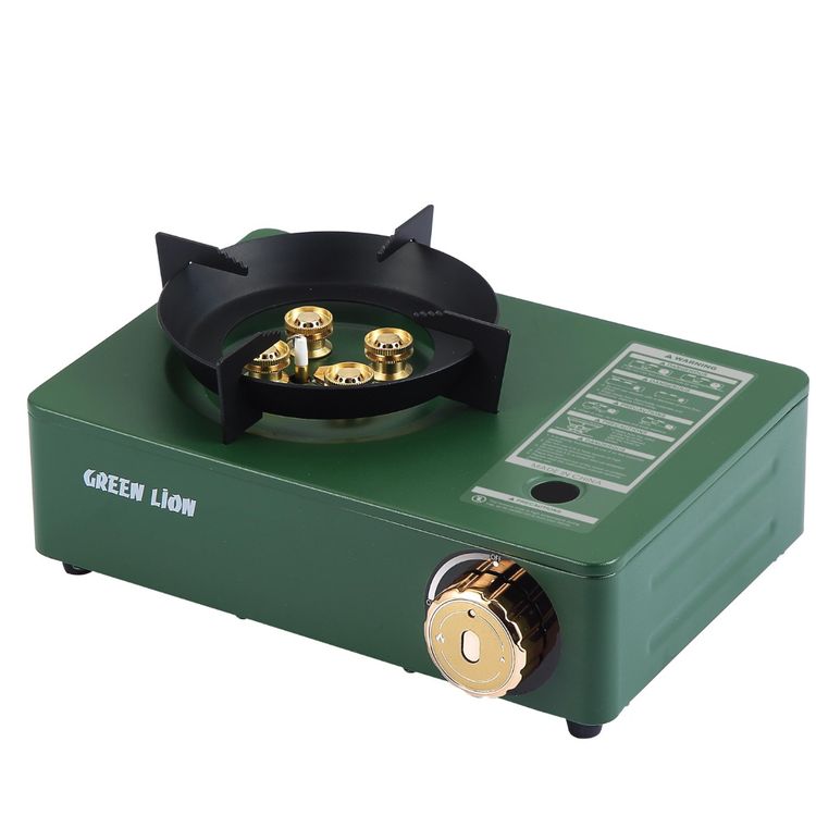 Green Lion 4 Burners Mini Cassette Stove with Iron & Stainless Steel Material, 60kg Load Bearing, Electromagnetic Suction Valve, Adjustable Knobs, Camping Friendly - Green