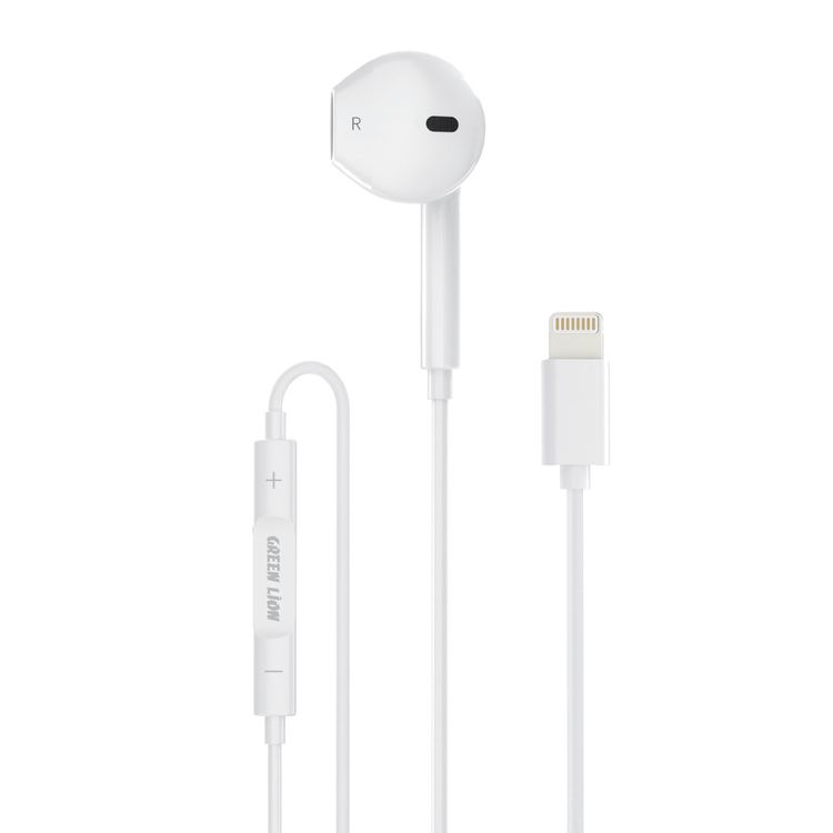 Green Lion Wired Mono Earphone with Lightning Connector, Control Buttons, 1.2m Cable Length, TPE & Copper Material, 14.2mm Speaker Size - White