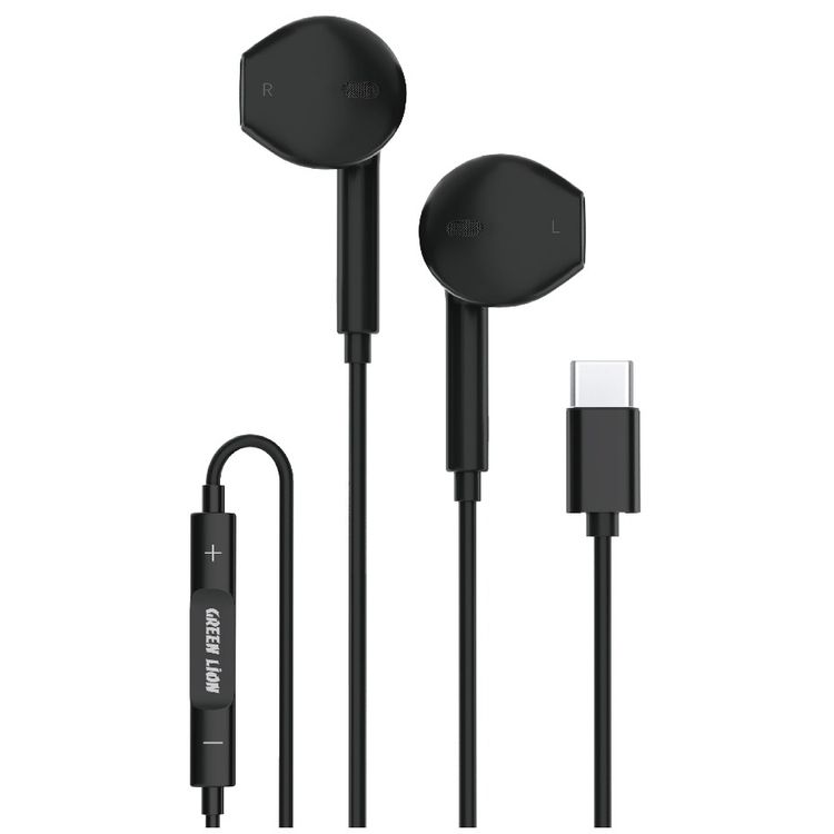 Green Lion Stereo Earphone with 1.2m Cable Length, Stereo Surround, Control Buttons, Type-C Connector, 32 Ω impedance, TPE+Copper Wire Material - Black