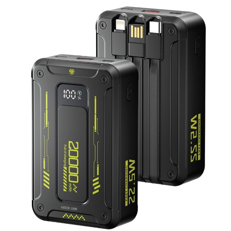 Green Lion Xtreme 20 Power Bank 20000mAh, PD 22.5W, Built-in Cable, Lightning & USB-C Cables, USB-A & USB-C Ports, Digital Display, Lightning Cable, USB-C Cable, USB-A Port, USB-C Port - Black