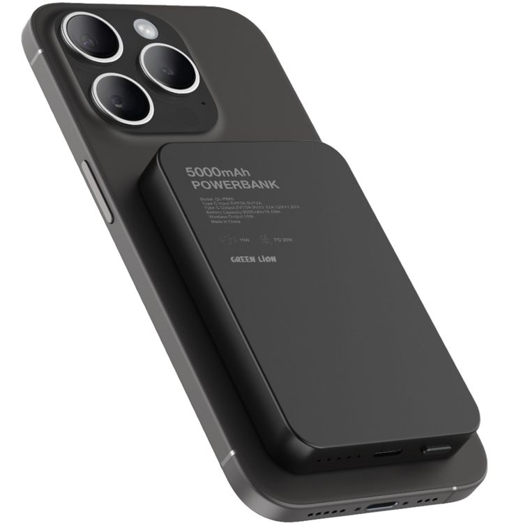 Green Lion GL-MAG 5000mAh Power Bank with 20W Power Delivery, MagSafe Charging, LED Indicator, 15W Wireless Charging, Slim Design - Black