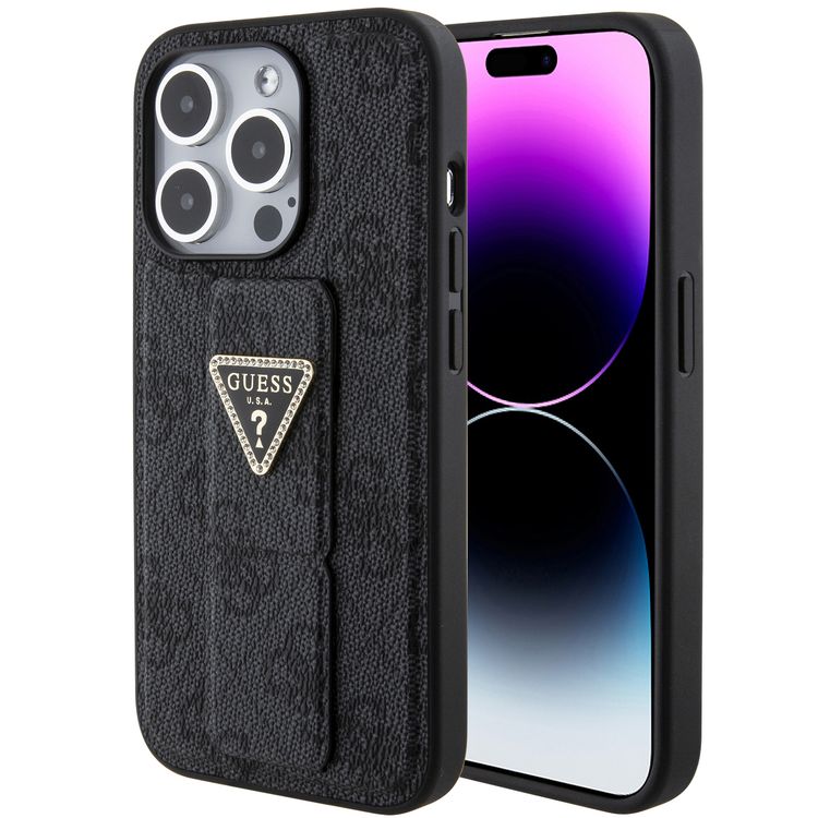 Guess Gripstand PU Leather Case with 4G Triangle Strass Pattern - Black - iPhone 15 Pro Max