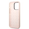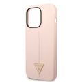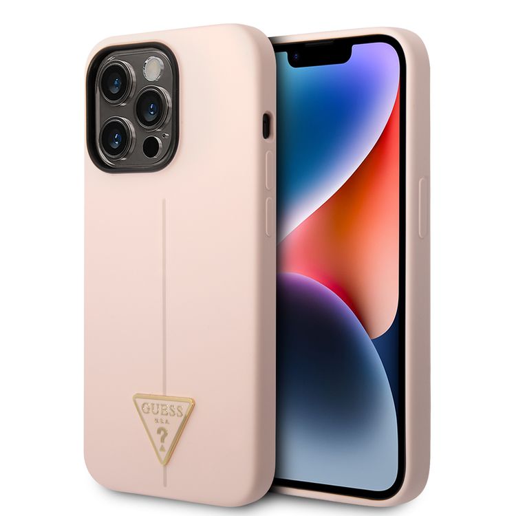 Guess Liquid Silicone Case with Shiny Line & Metal Triangle Tone Logo iPhone 14 Pro Compatibility - Pink