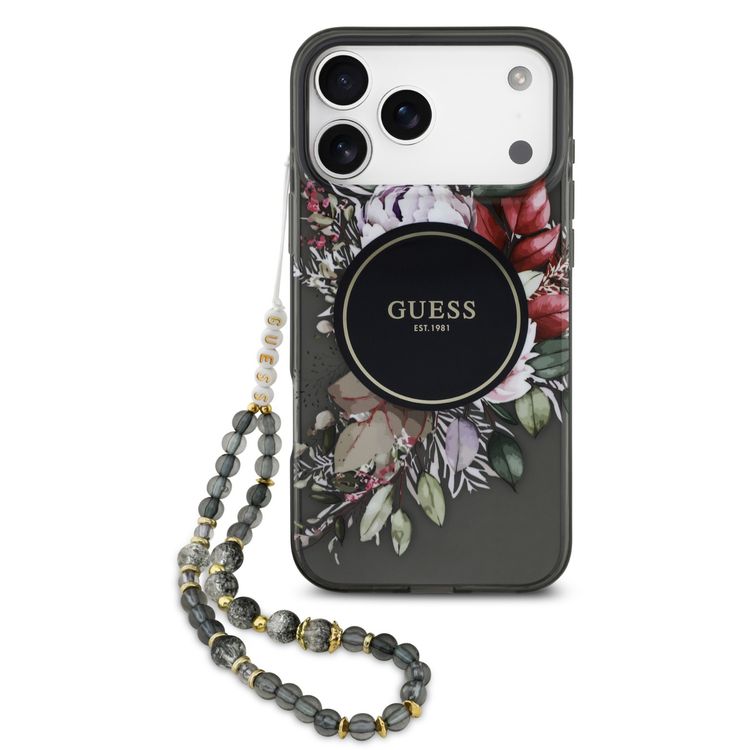 Guess MagSafe IML Case with Flowers Pattern & Lanyard for iPhone 17 Pro, Easy Snap-On, Sustainable Packaging, Comfortable Grip, Drop Protection, Slim & Lightweight Design - Black