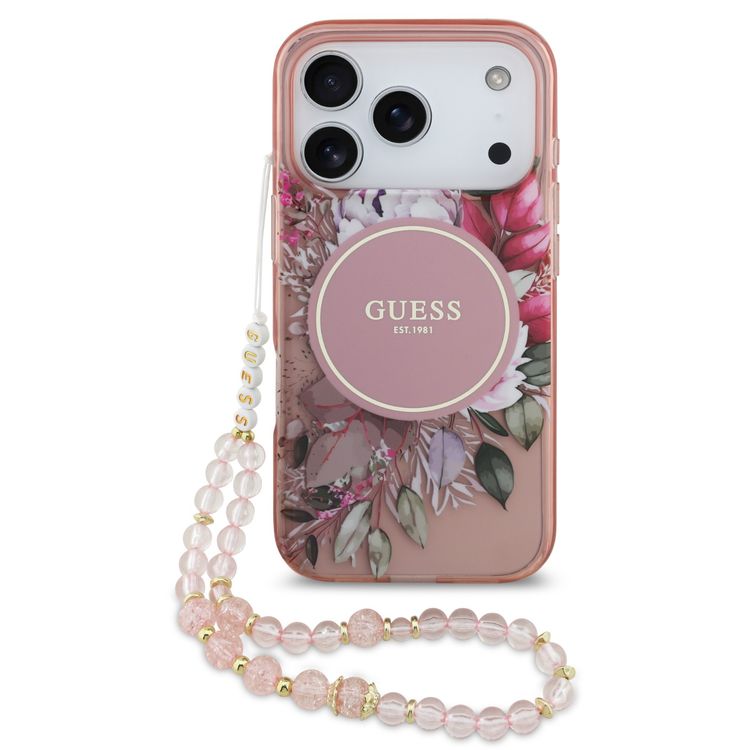 Guess MagSafe IML Case with Flowers Pattern & Lanyard for iPhone 17 Pro, Easy Snap-On, Sustainable Packaging, Comfortable Grip, Drop Protection, Slim & Lightweight Design - Pink