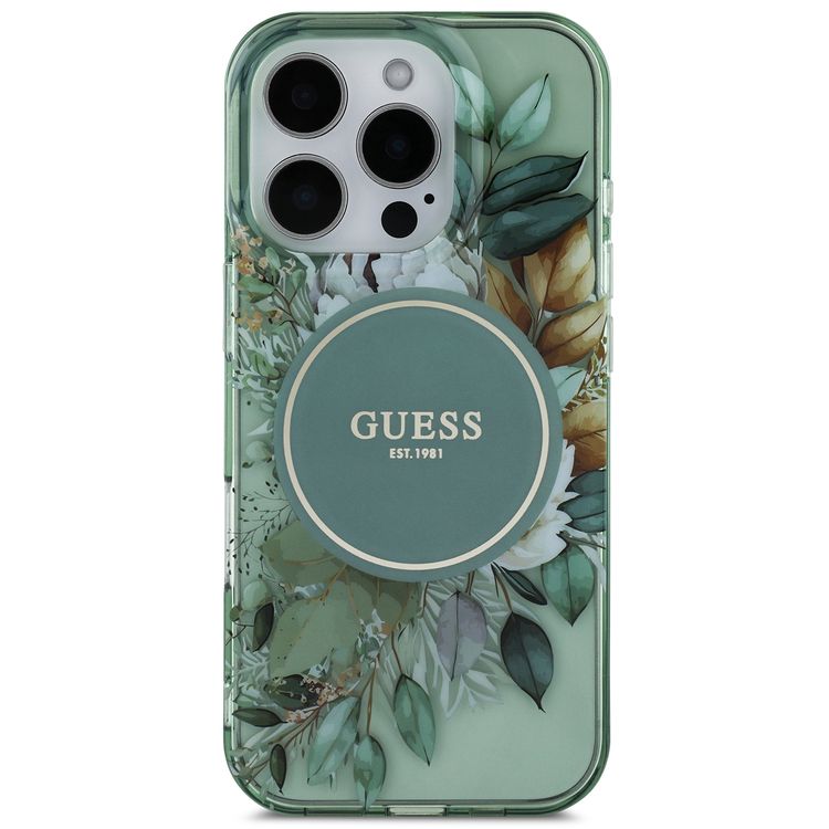 Guess Magsafe IML Hard Case With Flower Design & Pearl Strap For iPhone 16 Pro Max, Drop Protection, Slim Fit, Accurate Cutouts, Easy Snap-On - Green