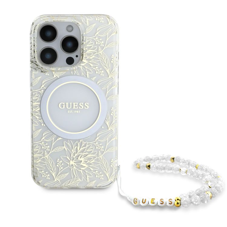 Guess Magsafe IML Hard Case with Pearl Strap & Electroplated Flower Design for iPhone 16 Pro Max, Easy Snap-on, Drop Protection, Comfortable Grip - White