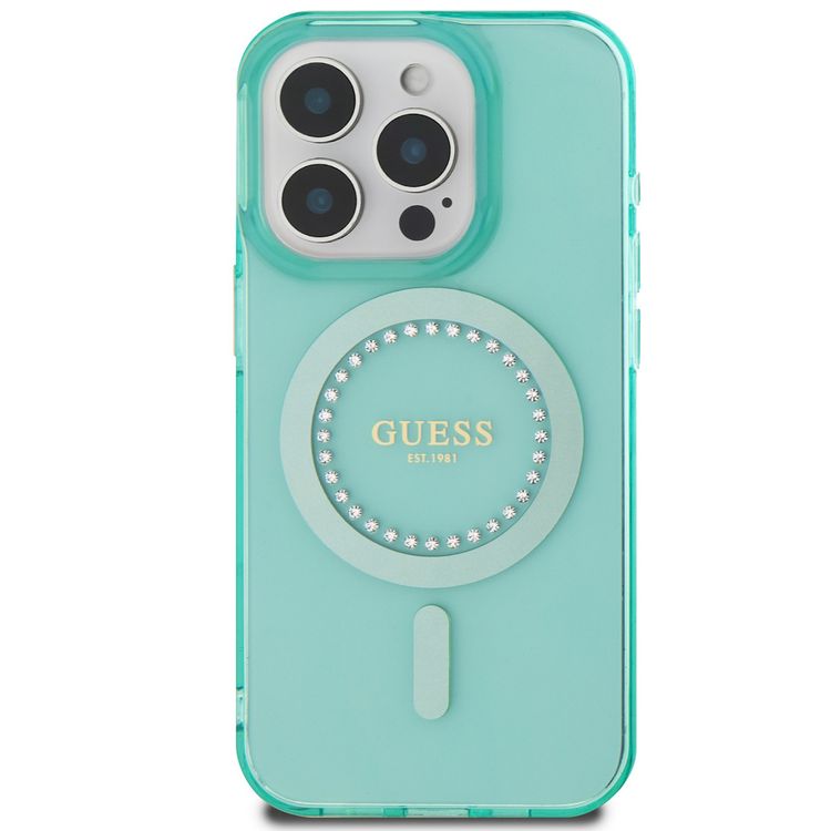 GUESS MagSafe IML Hard Case with Rhinestones Design for iPhone 16 Pro Max, Easy Snap-On, Drop Protection, Slim Profile - Green