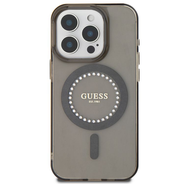 GUESS MagSafe IML Hard Case with Rhinestones Design for iPhone 16 Pro Max, Easy Snap-On, Drop Protection, Slim Profile - Black
