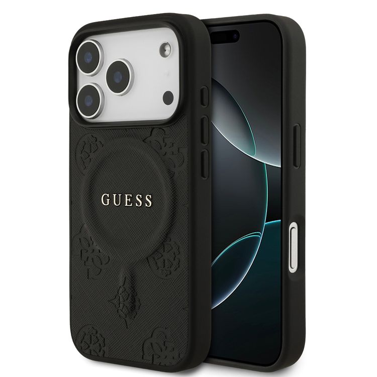 Guess MagSafe PU Leather Case with Classic Logo & Peony Hot Stamp Design for iPhone 17 Pro, Slim Profile, Easy Snap-On, Sustainable Packaging, Comfortable Grip, Drop Protection - Black