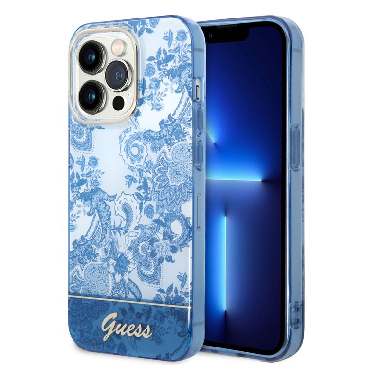 Guess PC/TPU IML Case With Double Layer Electroplated Camera Outline & Toile De Jouy - iPhone 14 Pro - Blue