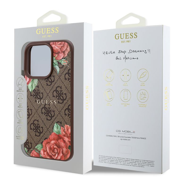 Guess PU 4G Hard Case with Roses Metal Logo for iPhone 16 Pro Max with Easy Snap on, Secure & Comfortable Grip, Raised Camera Edge - Brown