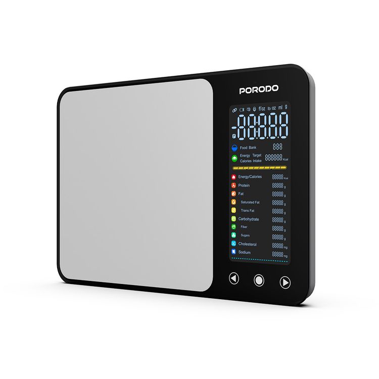 Porodo Kalio Smart Food Kitchen Scale with 3-5000g Weighing Range, IPX5 Water Resistant, Tempered Glass Platform, 5°C to 40°C Operating temperature - Silver