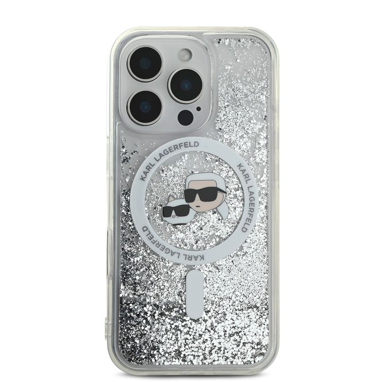 Karl Lagerfeld Magsafe Liquid Glitter Hard Case with Karl & Choupette Head for iPhone 16 Pro Max, Drop Protection, Shock Absorption, Precision Cutouts, Sparkling Glitter Design - Transparent