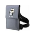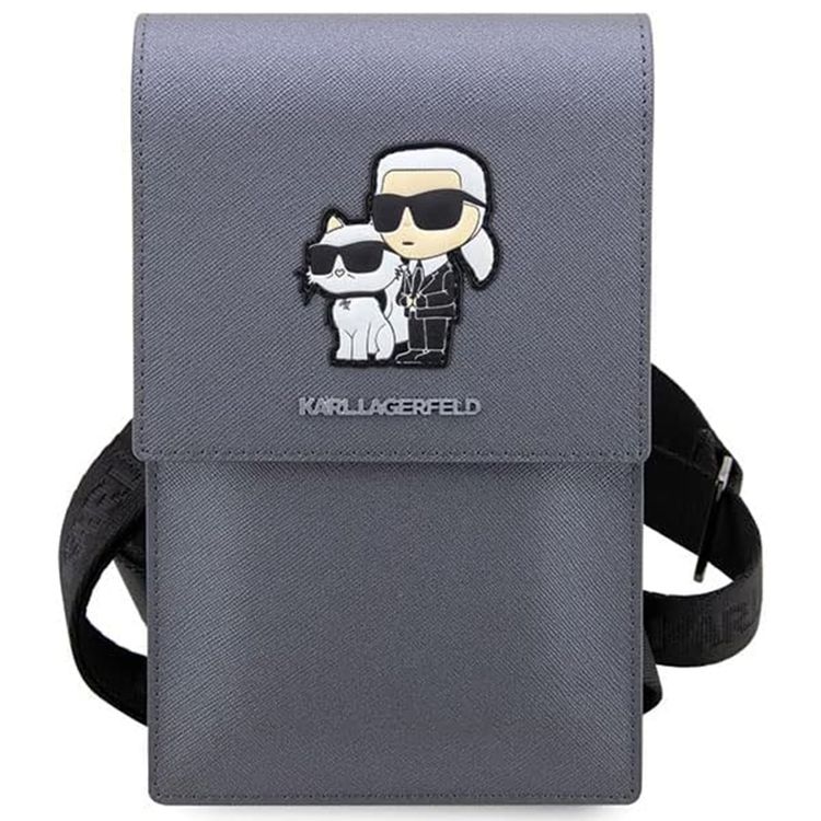 Karl Lagerfeld Saffiano Phone Pouch with K&C NFT Logo, Adjustable Shoulder Strap, Multiple Compartments, 3 Card Slots, Water Resistant - Silver