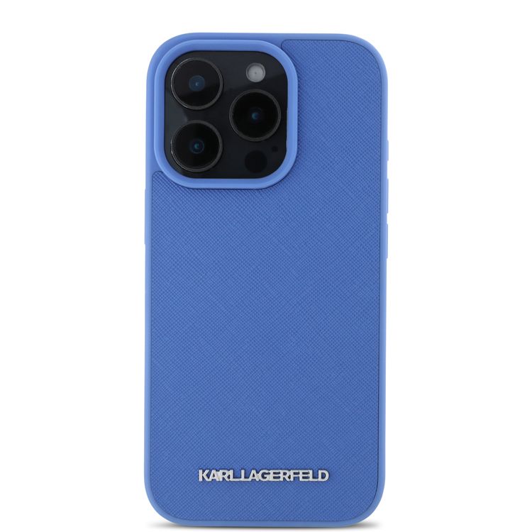 Karl Lagerfeld Saffiano Leather Hard Case with Elongated Metal Logo for iPhone 16 Pro, Drop Protection, Slim Profile - Blue