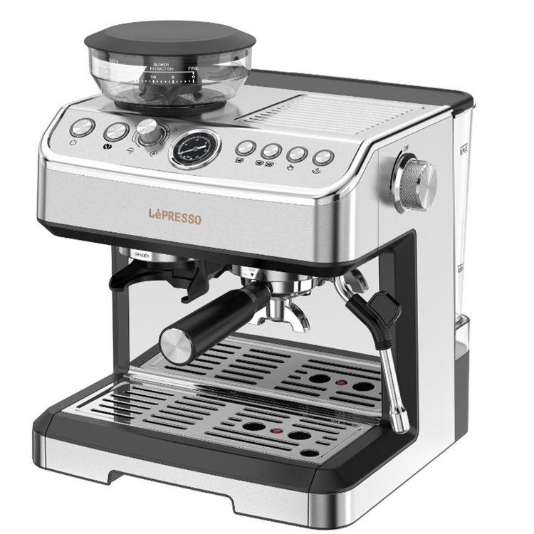 LePresso 20 Bar Espresso Coffee Maker with Bean Grinder, Cup Warmer, Milk Steamer, Multiple Brewing Options - Silver