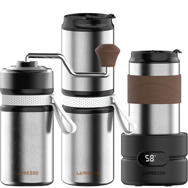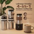 LePresso 4-in-1 Outdoor Coffee Set with Drip Coffee, Grinder & Water Boiler, 20g Bean Cup & 150mL Coffee Cup Capacity, 13W Rated Power, Heated Water Function, Adjustable Grind Settings - Silver