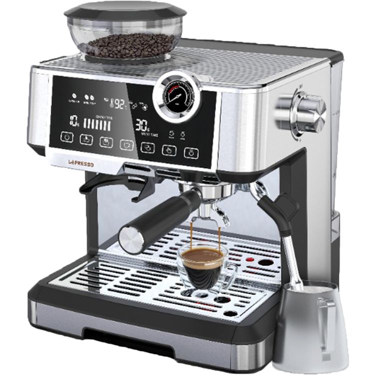 LePresso Advanced Espresso Machine Interactive Touch Display, 19 Bar ULKA Pump, 1350W, 2.5L Water Tank Capacity, Boiler Gauge, Conical Burr Grinder, Adjustable Grind Settings - Silver