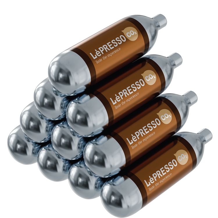 LePresso CO2 Chargers for Sparkling Water Bottles, 66mm Length, Over 15MPa Pressure Strength, 8g per Cylinder Gas Weight - Silver