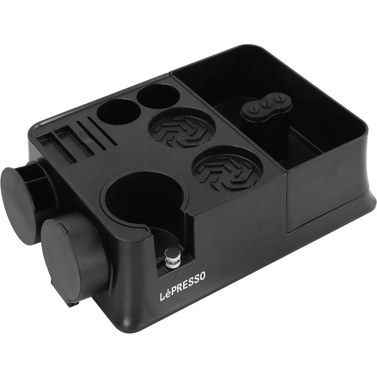 LePresso Tamping Station for 51/58 Portafilter Baskets, ABS Plastic & Silicone Material, Multi-Slot Base, Durable & Compact Design - Black