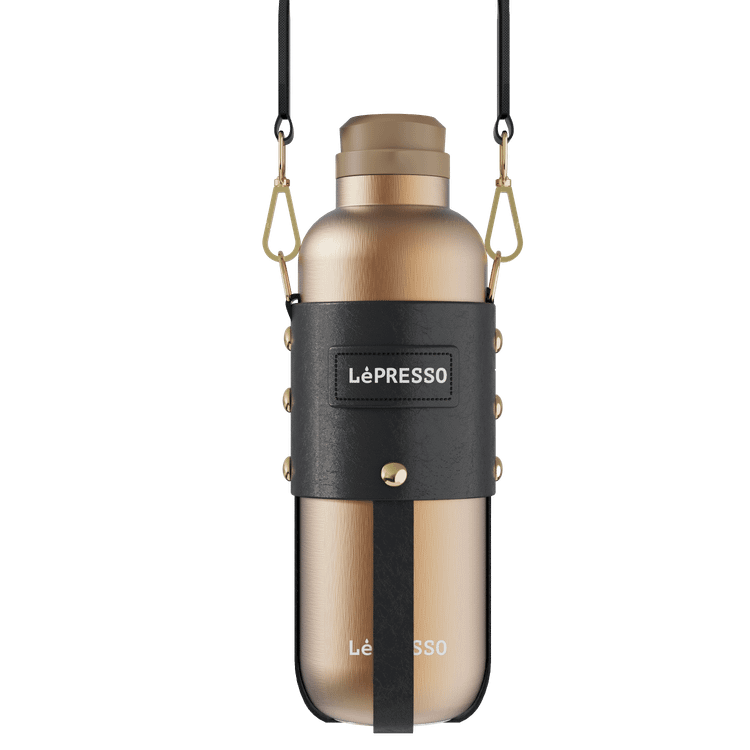 LePresso ThermaTrail Thermos Bottle with Crossbody Strap, 650 mL Capacity, -20°C to 100°C Water Temperature Range, Leather Strap Material, Tea Brewing, 316 + 304 Stainless Steel+PP+Silicone Material - Gold
