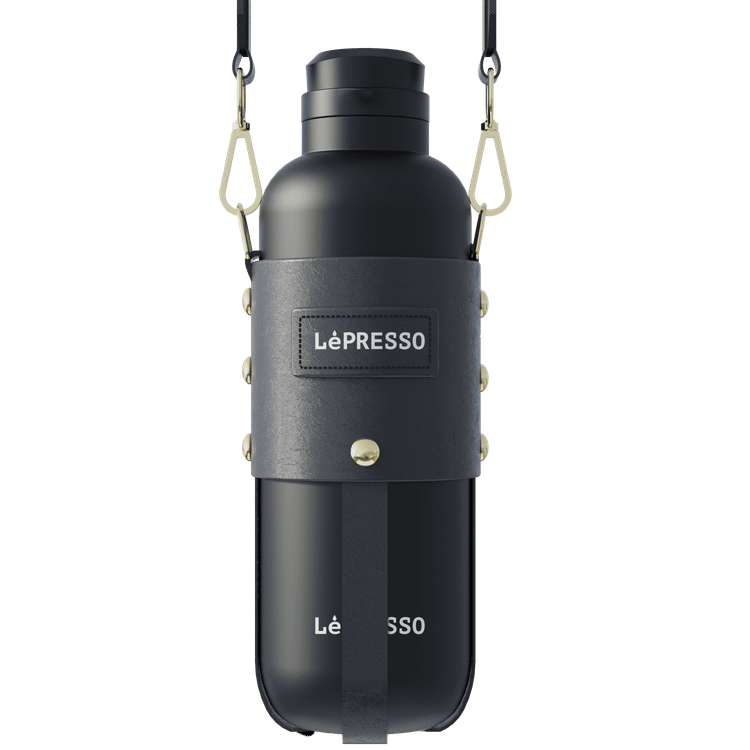 LePresso ThermaTrail Thermos Bottle with Crossbody Strap, 650 mL Capacity, -20°C to 100°C Water Temperature Range, Leather Strap Material, Tea Brewing, 316 + 304 Stainless Steel+PP+Silicone Material - Black