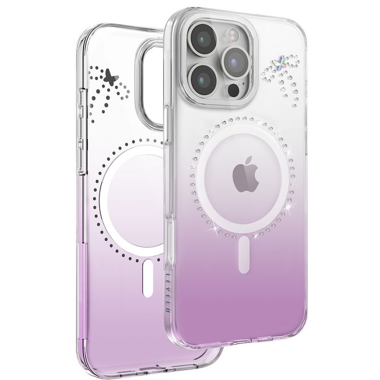 Levelo Butterfly Magsafe Case for iPhone 16 Pro with Premium Crystal Finish, Ultra-Thin TPU Materials, Swarovski Crystals, Clearview Technology, Strong Magsafe Magnet - Transparent/Purple