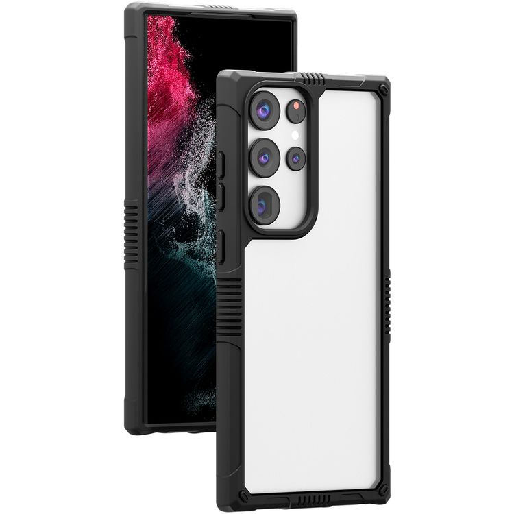 Levelo Clara Hybrid Clear Case for Samsung Galaxy S23 Ultra, Shockproof Edges, Anti-Fingerprint, Non-Slip Grip Lines, Camera Ring - Black