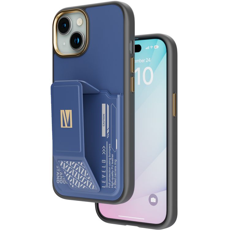 Levelo Morphix Cuero Gripstand Case for iPhone 15 Plus with Cardholder, Multi-Positioning Modes, PU Leather Material, Shock-Proof Edges - Blue