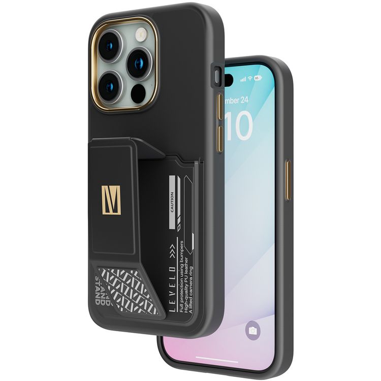 Levelo Morphix Cuero Gripstand Case for iPhone 15 Pro with Cardholder, Multi-Positioning Modes, PU Leather Material, Shock-Proof Edges - Black