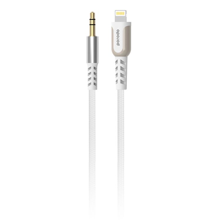 Porodo Lighting to Aux Cable with 1.2m Length, Anti-tangle, Universal Compatibility, 3.5mm Audio Jack, Plug & Play, Braided - White