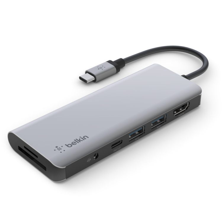 Multiport Adapter Belkin AVC009btSGY USB-C 7 in 1 Multiport Adapter-Grey The perfect all-in-one USB-C hub solution for connecting a USB-C laptop to multiple devices using a single tethered USB-C cable. With a compact design, 4K HDMI 1.4 resolution capabilities, and up to 100W Power Delivery, you’re set up for success. This slim, portable USB-C adapter allows you to easily create a workstation anywhere and makes traveling between workspaces easy. With pass-through charging up to 100W, there’s no need to choose between port expansion and power. Perfect for remote and flex-work schedules, this USB-C hub adapter is small and simple enough to take anywhere and set up a mini workstation in moments. An aluminum finish matches popular devices and looks great when you’re at home, office, or school. Go ahead and get in the zone. The USB-C port supports pass-through power up to 100W, so your laptop or mobile device is always getting a charge. Expand your screen space and get crystal-clear resolution when you get to work. Just connect your 4K monitor using the HDMI 1.4 port. USB-C laptops and tablets, MacBook Pro 13" M1 (2020), MacBook Air 13" M1 (2020), Mac mini M1 (2020).