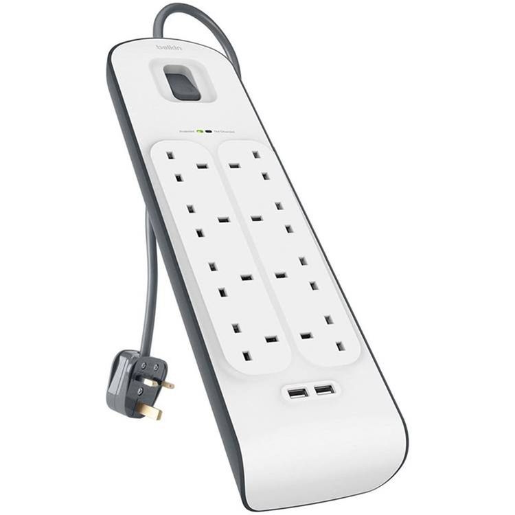 Belkin Surge Protector, 2× USB-C Ports, 2m Cable Length, Plastic & Metal Material, 8 Outlets Power, Type-G Power Plug - White