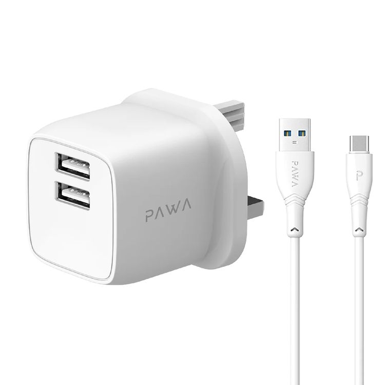 PAWA PocketMini Dual USB Travel Charger UK Standard With USB-A to Type-C Cable - White