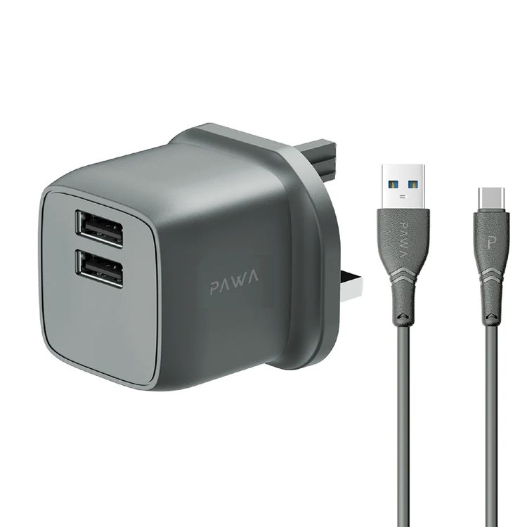 PAWA PocketMini Dual USB Travel Charger UK Standard With USB-A to Type-C Cable - Grey