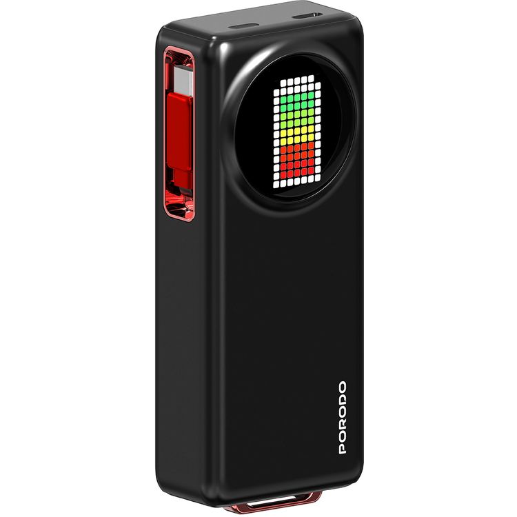 Porodo 10000mAh Animated Display Power Bank with 68cm Retractable Type-C Cable, Over 300 Charge Cycles, 45W Power Delivery, Simultaneous Charging - Black