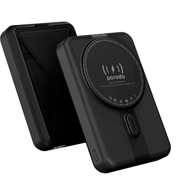 Porodo 10000mAh Digital MagSafe Power Bank & Stand with 20W PD, Type-C, USB-A, 15W Wireless Charging, Strong Magnetic Hold - Black