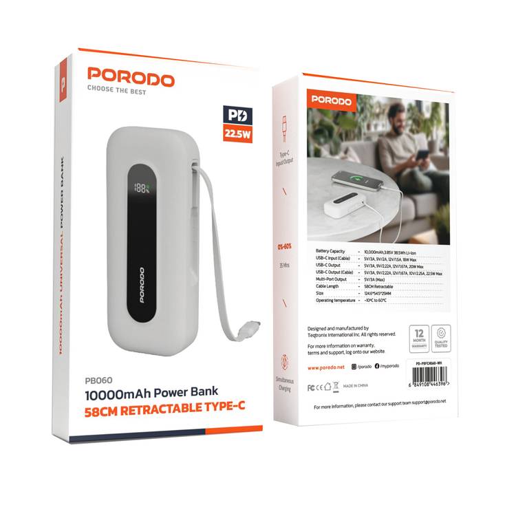 Porodo 10000mAh Power Bank with Type-C Port & Integrated Type-C Cable, Digital Display, PD 30W, Lightweight & Portable - White
