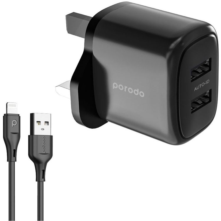 Porodo 12W Double USB 2.4A Charger UK with A-Lightning 1.2M Cable - Black