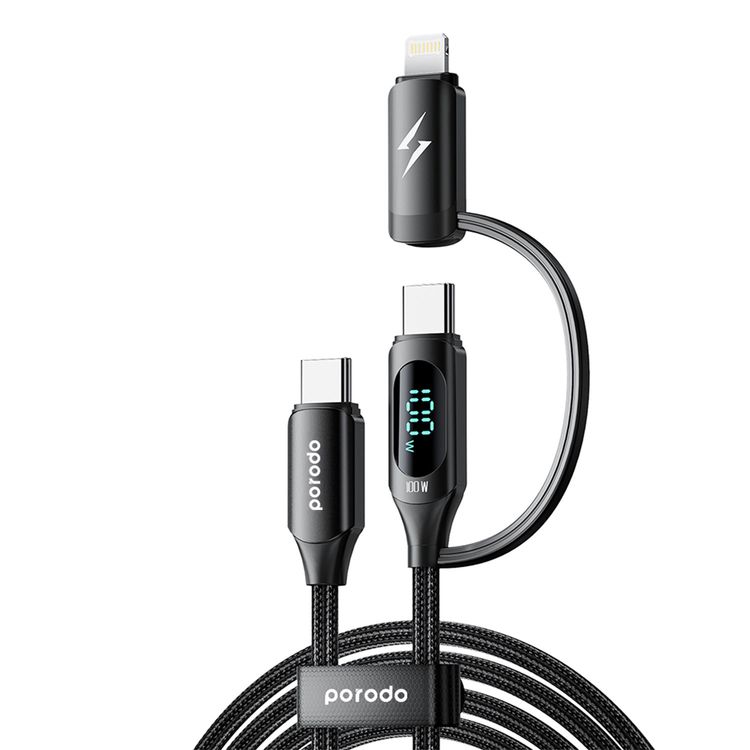 Porodo 2-IN-1 Charging Cable with Digital Display, Fast Charging C to C and Lightning - Black - 1.2M