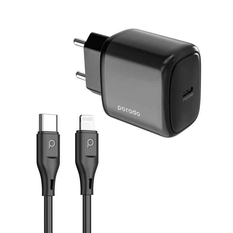 Porodo EU Quick Charger with 1.2m USB-C to Lightning Cable, 20W Power Delivery, Overheat Protection, Simultaneous Charging, 0%-60% Charge in 35 Minutes - Black