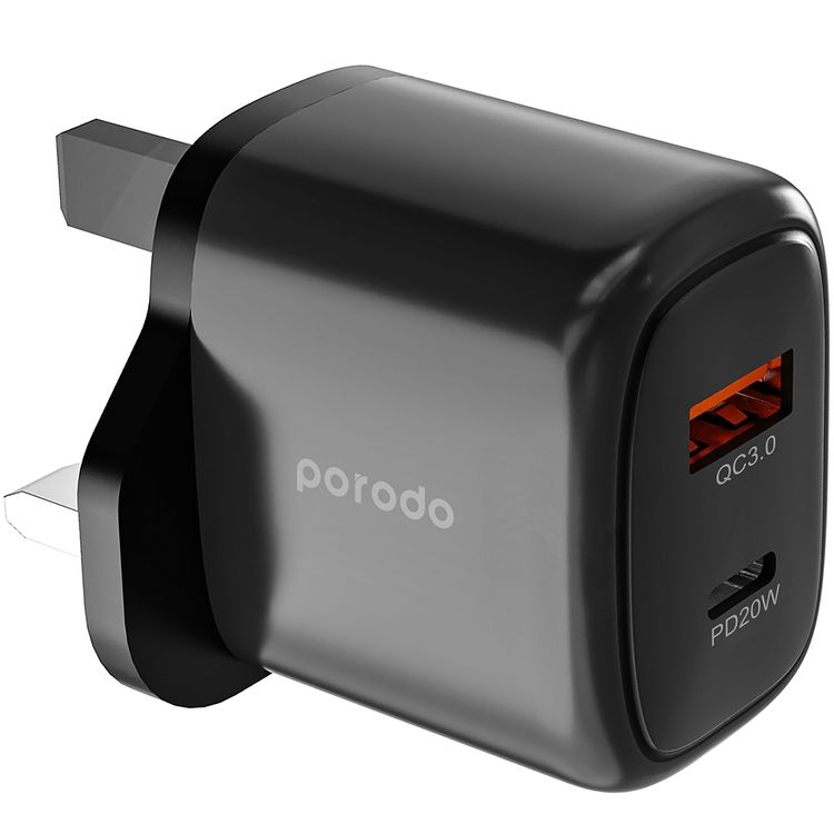 Porodo Dual Output Quick Charger with 20W Power Delivery, QC 18W, UK 3-Pin Plug, Simultaneous Charging, Universal Compatibility - Black
