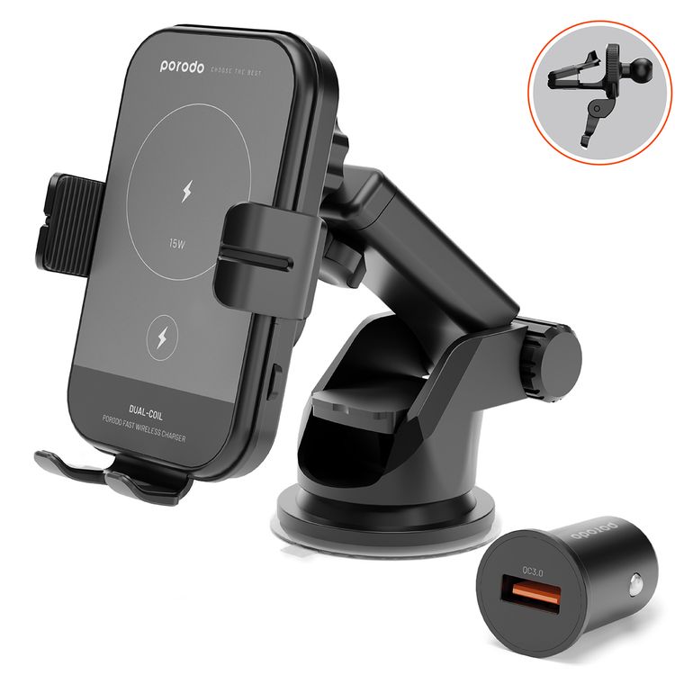 Porodo 3 in 1 Car Charger Mount 15W With QC3.0 Car Charger