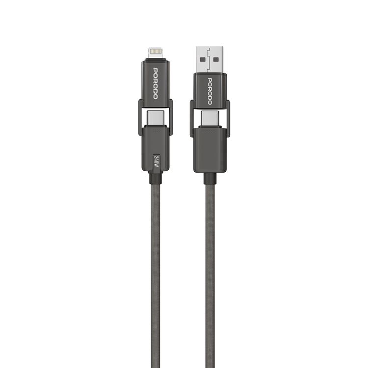 Porodo 4-in-1 Braided High-Speed Charging Cable with USB-C & USB-A Inputs, Lightning & Type-C Outputs, 240W USB-C to USB-C Output, Universal Compatibility - Black